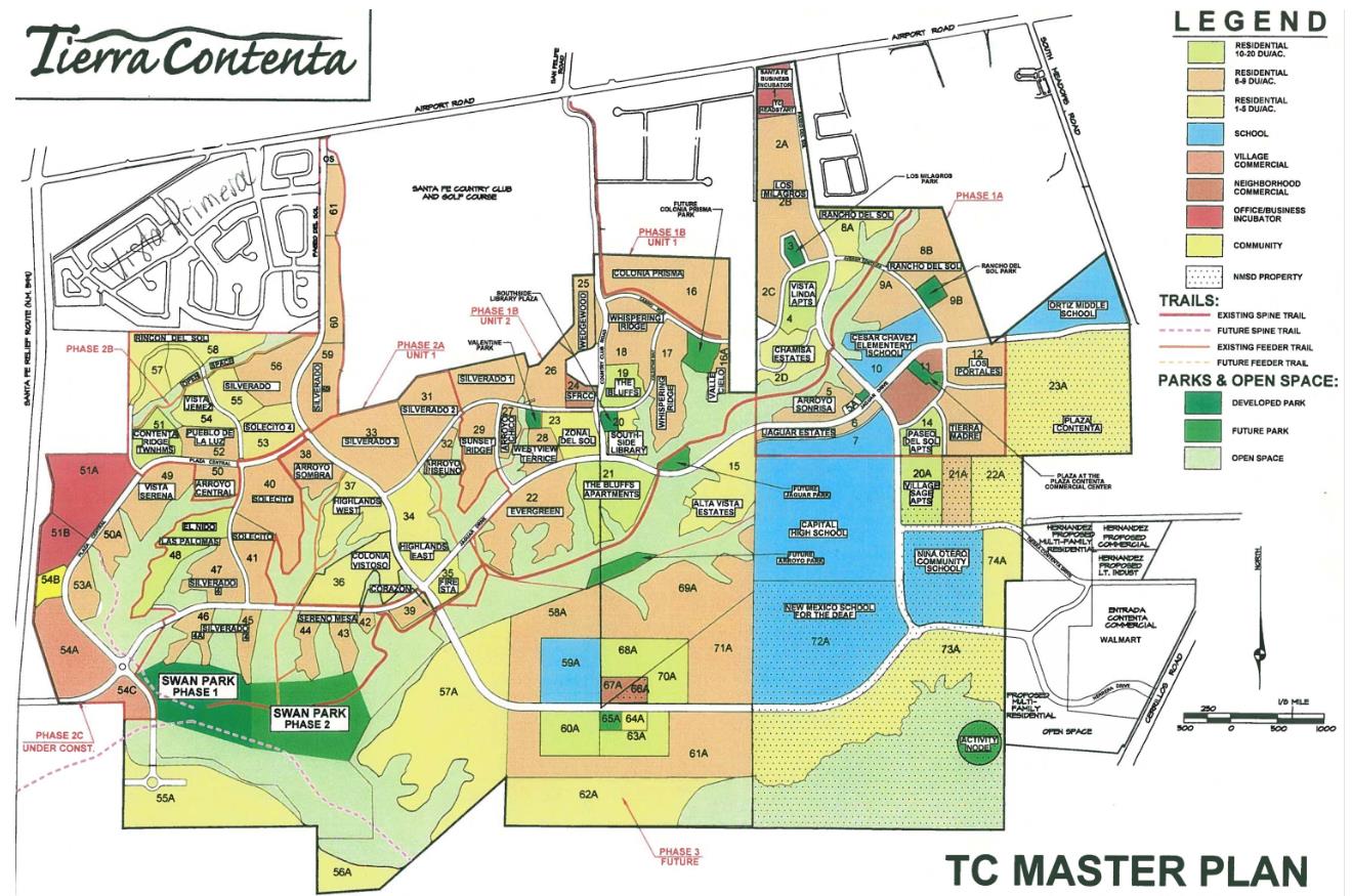 In October of 2021, the Santa Fe City Council approved an amendment to the Tierra Contenta Master Plan, focused on approximately 216 acres of land referenced as Phase 3A. The remainder of land in Phase 3 is owned by the New Mexico School for the Deaf (NMSD), and there are no plans to develop Phase 3B at this time. The purpose of the 2021 Master Plan Amendment was to respond to shifting market conditions, to provide more housing diversity, to improve pedestrian connectivity, and to implement design changes to address lessons learned from previous phases. The following is the resulting land use summary for Phase 3A: